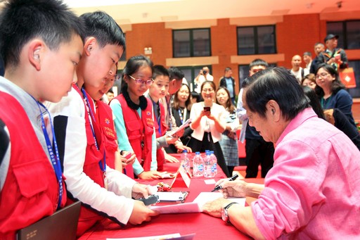 5月10日,“與藝術(shù)大師面對面”韓美林上海郵迷見面會在上海市郵政分公司郵政大樓中庭舉行。見面會上,韓美林講述了自己的“郵票情緣”,并為從四面八方趕來的各個(gè)年齡段的郵迷在己亥年生肖郵品和集郵文化叢書《美林郵緣》上簽名,還特地為多位“資深郵迷”手繪生肖豬。一位排了3小時(shí)隊(duì)拿到大師簽名的年輕郵迷激動(dòng)地說:“我特地連夜從杭州乘火車趕來,能夠一睹大師風(fēng)采,覺得特值。”圖為韓美林為慕名前來的《小主人報(bào)》的小記者們簽名。 □上海記者 周煉 攝影報(bào)道