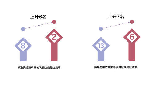 通過設置廊坊區域集散點,縮短了距離,提高了次日遞率。從保定到天津的郵路,原來的路由是保定到石家莊再到天津,里程為590公里,調整后的路由是由保定到廊坊再到天津,里程為249公里。從衡水到天津的路由是從衡水到石家莊再到天津,里程為586公里;調整后的路由從衡水到廊坊再到天津,里程為405公里(見圖表3)。至4月底,標準快遞菜鳥天地次日達線路達成率行業排名第2,較提速前上升了6名;快遞包裹菜鳥天地次日達線路達成率行業排名第6,較提速前上升了7名(見圖表4)。