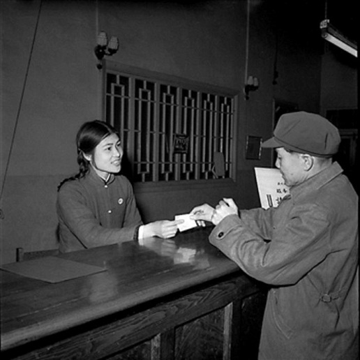 1958年4月,北京東四郵電局,營業(yè)員廉旻(圖左)主動向顧客介紹業(yè)務。當年,東四郵電局涌現(xiàn)出了常秀珍、沈秀敏、章秀敏、喬秀蘭和廉旻優(yōu)秀服務群體,人稱“四秀一廉”。 工人日報 杜治 攝