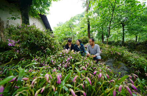 穿過(guò)竹林,孫茂梅來(lái)到農(nóng)戶袁二妹家的石斛花田。蒼翠的樹(shù)叢間,粉紫色的石斛花滿山滿谷,一簇簇、一團(tuán)團(tuán),散發(fā)著淺淺的清香。