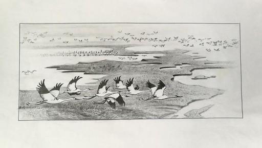 “這枚郵票是整套郵票中創作設計難度最大,也是修改次數最多的?!睏罾蠋熃榻B,起先并不清楚東方白鸛與白鶴的差別,經過專家的詳盡介紹才了解到,白鶴飛時翅膀是展開的、有些分散,而白鸛飛時翅膀仍然比較整齊。在后期修改時,白鸛的特寫和造型單獨畫了好幾次,再借用電腦進行合成處理。山與水、湖與江、鳥與草,為了前后照應,楊老師在該枚郵票上運用了一些西洋手法,實現了中西合璧。