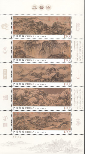 最終,這幅“不求形似,唯求達意”的名畫被定格于一套5枚郵票之上,完整地展示了原畫獨特的風貌。第一圖為“日觀晴曦”,表現(xiàn)泰山旭日東升的壯觀景致。第二圖“太華清秋”描繪的是華山懸崖峭壁的險峻山勢,蒼松小橋,瀑樹相映。第三圖“融峰雨色”刻畫的是衡山祝融峰煙雨縹緲的夏日景致。第四圖“恒塞積雪”展現(xiàn)的是恒山白雪皚皚的冬季景觀。第五圖“二室爭奇”表現(xiàn)的是嵩山叢山峻嶺的中原山脈及點綴其間的清幽古寺。