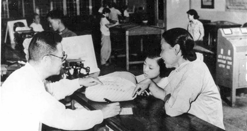 1958年,東四郵局沖破思想的藩籬,在全行業(yè)率先做到“從臺后到臺前”,為用戶提供服務。圖為東四郵局老“郵務佐”于洪澤(左一),主動轉(zhuǎn)變思想,帶領大家走出柜臺為用戶填寫單據(jù)。 (資料圖片)