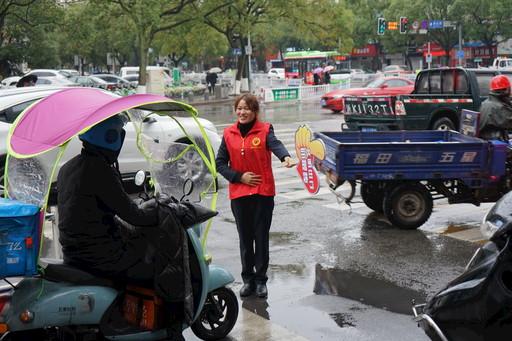 12月19日早高峰時段,浙江省樂清市郵政分公司的黨員志愿者走上街頭,開展“文明垂范 志愿先行”活動?!澳茫堊袷亟煌ㄒ巹t,非機動車請退至安全線內等候紅燈?!秉h員志愿者身穿紅馬甲,手持“文明出行你最棒”勸導牌,耐心引導過往行人和非機動車輛遵守交通規則,勸導不文明交通行為。