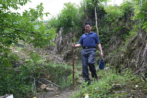 走訪貧困戶遇到山路陡峭時(shí),陳澤維用樹(shù)枝作拐杖。