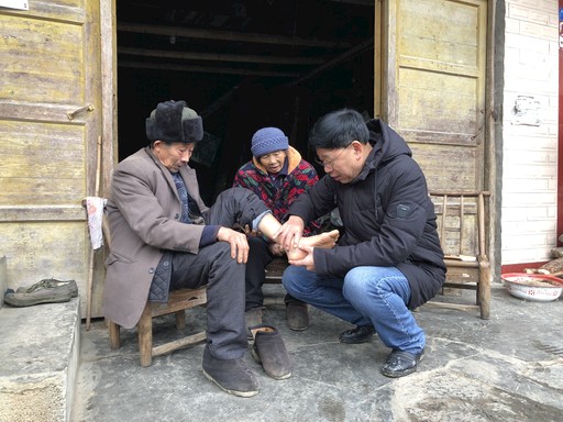 聽(tīng)說(shuō)貧困戶胡洋朋腳扭傷后,陳澤維到他家看望。胡洋朋像看到自家人一樣伸出腳讓陳澤維查看傷勢(shì)。