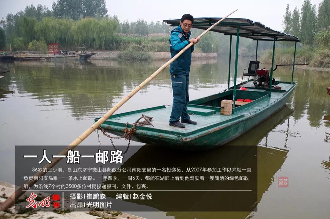 36歲的王少朋,是山東濟(jì)寧微山縣郵政分公司南陽支局的一名投遞員,從2007年參加工作以來就一直負(fù)責(zé)南陽支局唯一一條水上郵路。一年四季,一周6天,都能在湖面上看到他駕駛著一艘綠色郵政船,為沿線7個(gè)村的3500多位村民投遞報(bào)刊、文件、包裹。12年,他在這條水上郵路行駛了30多萬公里。