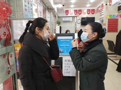 在四川省資陽(yáng)市樂(lè)至縣公園路郵政營(yíng)業(yè)大廳內(nèi),大堂經(jīng)理或?yàn)榭蛻魷y(cè)量體溫,或耐心指導(dǎo)客戶怎樣正確佩戴口罩,或向客戶講解防疫安全知識(shí),廳堂內(nèi)秩序井然。
