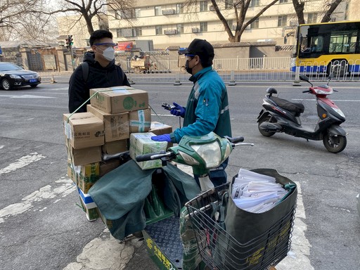 2月19日9點半,寒風(fēng)中,東四郵局北新橋投遞部投遞員張志福戴著護(hù)目鏡、口罩、一次性手套,站在某小區(qū)門口,一個接一個地?fù)芡ㄊ占说碾娫挘却麄儊眍I(lǐng)取包裹。11天前,這個小區(qū)出現(xiàn)一例新冠肺炎確診病例。從那時開始,附近的居民都繞著這個小區(qū)走。