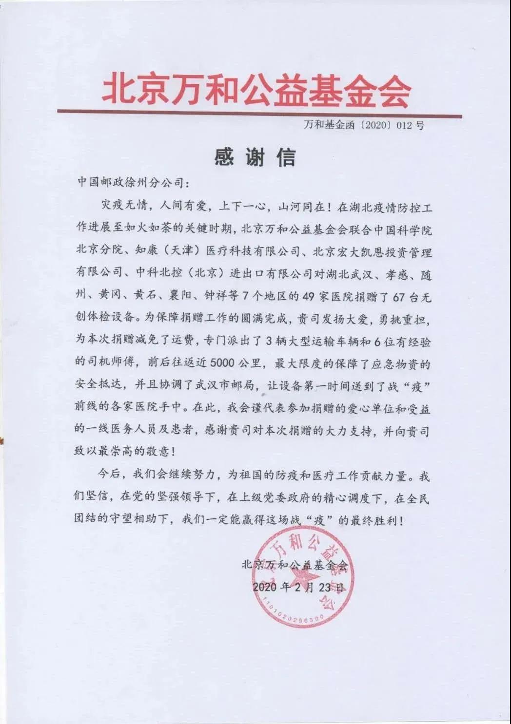 由于設備昂貴,捐贈企業還是表達了自己的擔憂,特意派人前來徐州郵政協調對接。劉永紅堅定地強調:“我們會按照集團公司保障綠色通道順暢的明確要求,嚴格落實交通運輸部的緊急任務指令,請不用擔心!”這才打消了捐贈企業的疑慮。