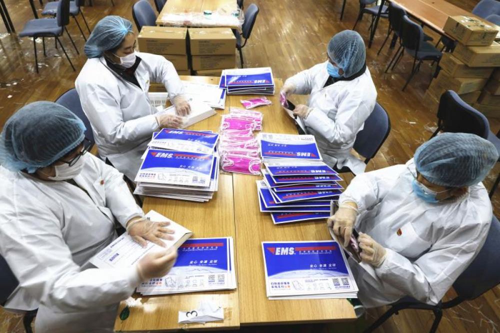 在青島郵政公司寄遞事業(yè)部,工作人員身著防護(hù)服,佩戴防護(hù)帽、口罩、手套,“全副武裝”忙碌著。他們加班加點(diǎn)將廠家送過來的口罩拆箱,然后裝進(jìn)快遞袋中,再裝箱后分發(fā)到各區(qū)市郵政分公司的攬投部。所有工作人員進(jìn)入裝件場地都要進(jìn)行嚴(yán)格消毒等安全防護(hù)工作,確保配送給廣大市民的口罩郵件安全衛(wèi)生。