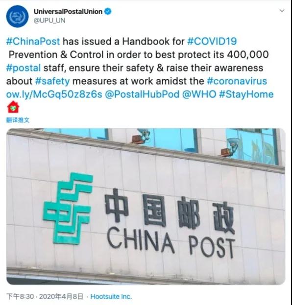 4月9日,萬國郵政聯盟在其官方社交媒體上發布了由中國郵政集團有限公司制作的《新冠病毒防護指導手冊》英文版,向世界分享中國郵政的疫情防控經驗。