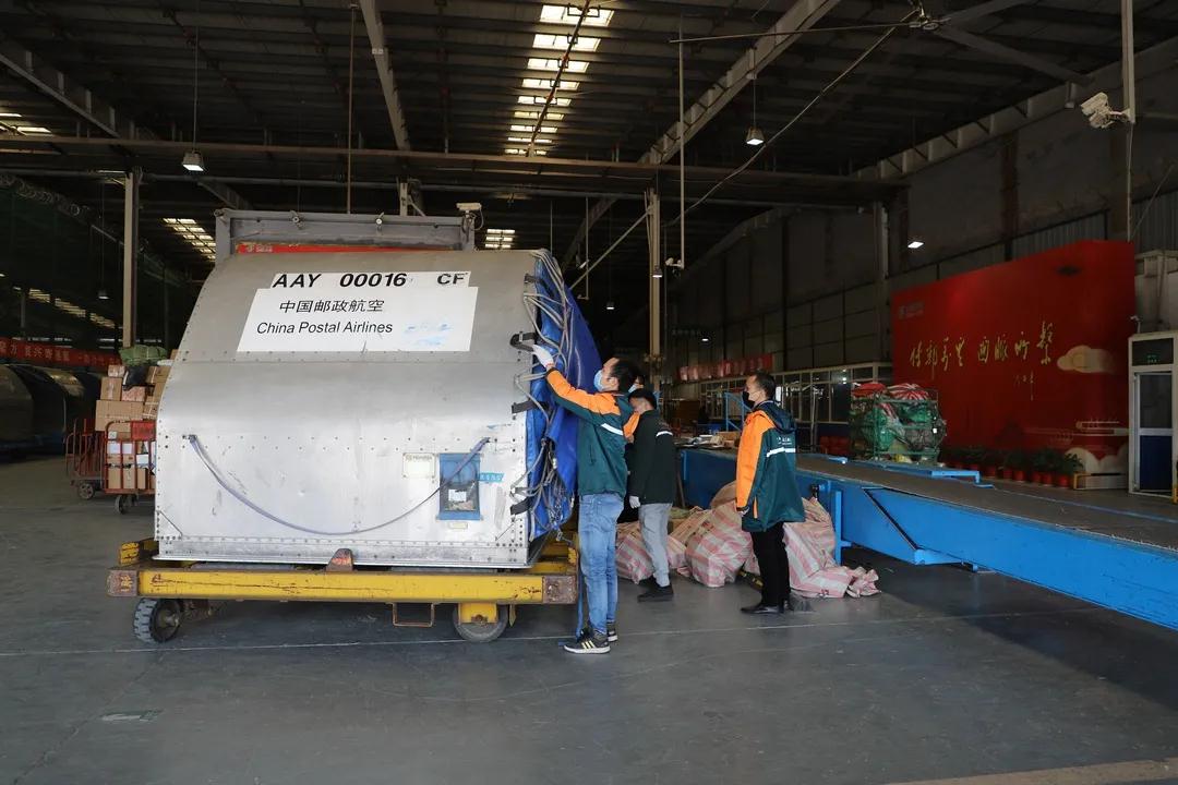 哈爾濱郵區(qū)中心局員工將郵航包機運抵的醫(yī)用物資進行裝車。