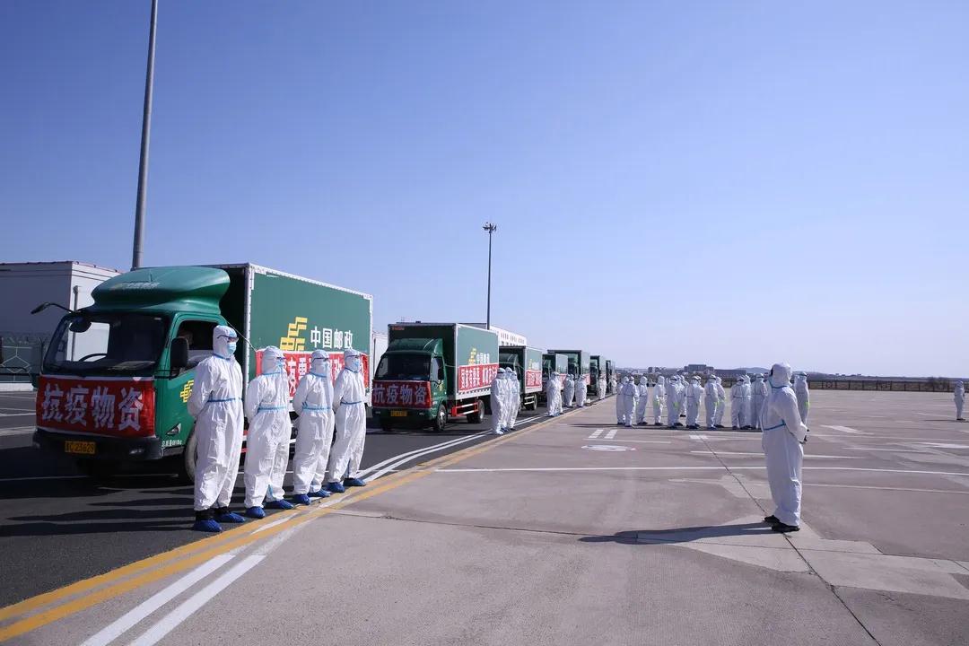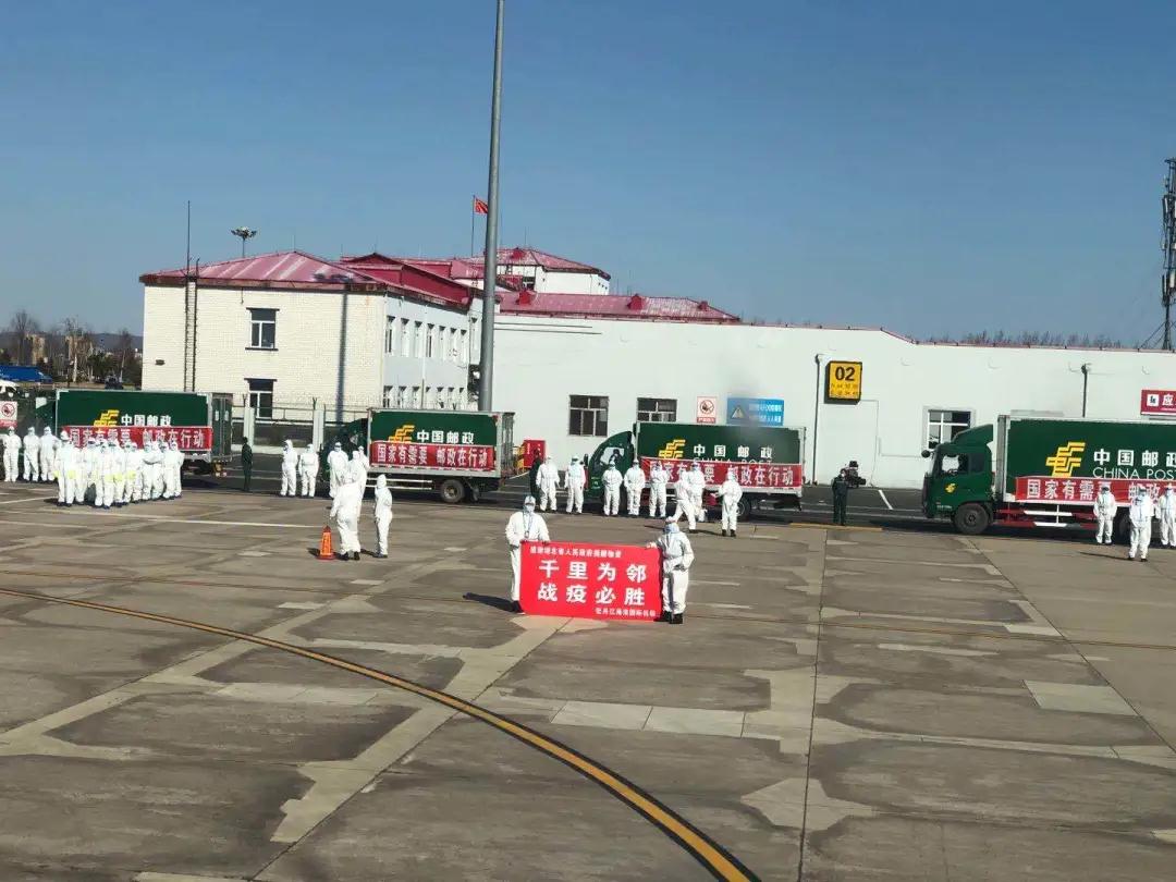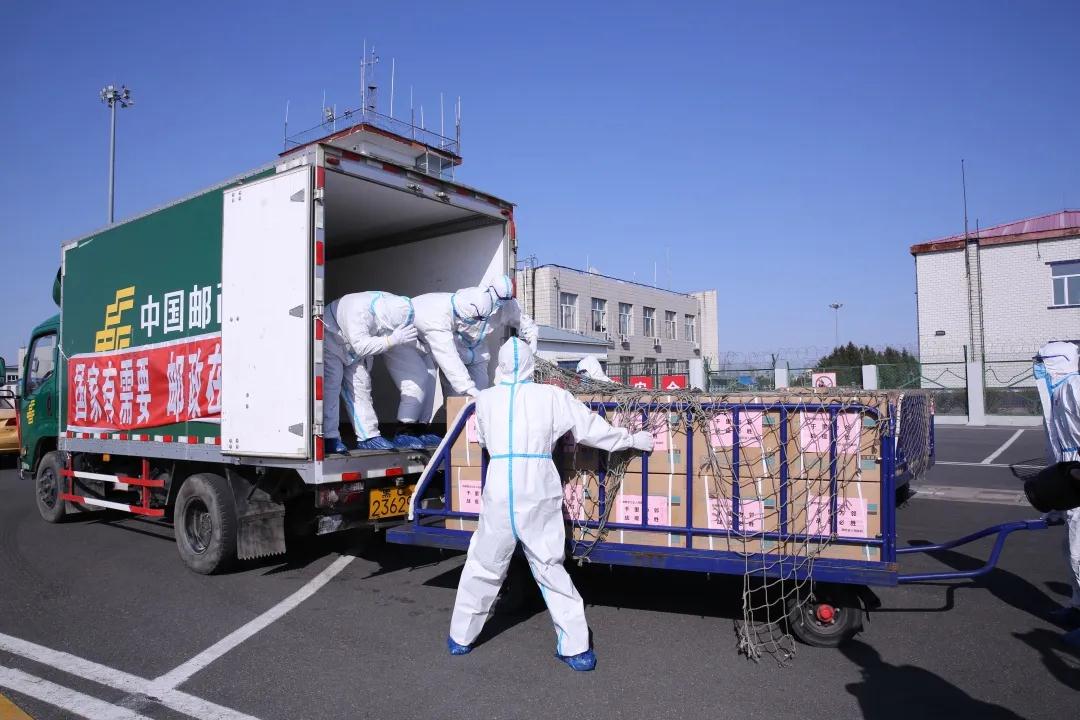 為及時將抗疫物資運送到綏芬河,黑龍江省郵政分公司召開緊急會議,相關負責人趕赴哈爾濱、牡丹江兩大機場一線指揮,并迅速組織哈爾濱郵區(qū)中心局和牡丹江市郵政分公司展開航班物資接卸及陸路運輸工作。哈爾濱郵區(qū)中心局接到通知后第一時間著手調配4臺22噸的郵政貨車,牡丹江郵區(qū)中心局緊急調配12噸、8噸、4噸等共10臺郵政貨車承擔運輸任務。