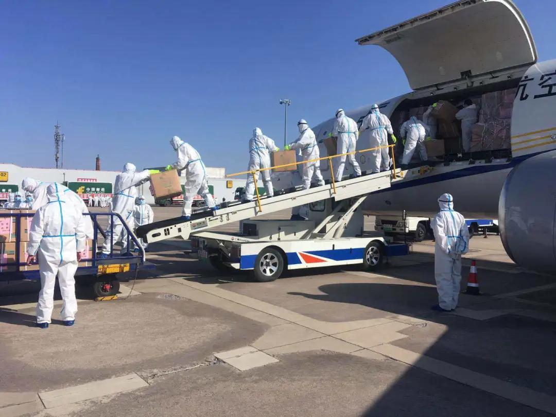 牡丹江機場地面保障人員接卸郵航包機運抵的醫(yī)用物資。