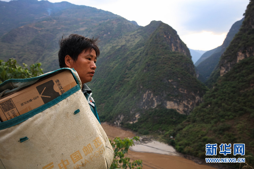 桑南才徒步送郵件途中休息,眺望怒江峽谷(5月12日攝)。新華網 劉東 攝