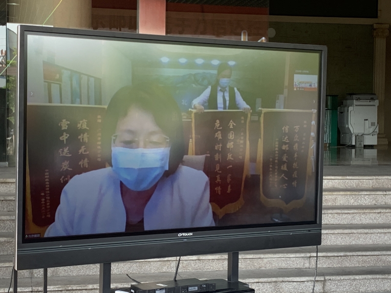 北京郵政副總經(jīng)理王艷遠程展示錦旗。