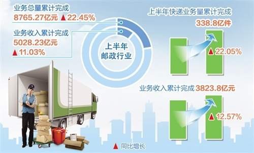 國(guó)家郵政局統(tǒng)計(jì)數(shù)據(jù)顯示,上半年,郵政快遞業(yè)逐漸擺脫新冠肺炎疫情影響逆勢(shì)上揚(yáng),主要經(jīng)濟(jì)指標(biāo)超過(guò)去年同期水平。1月至6月,郵政行業(yè)業(yè)務(wù)總量累計(jì)完成8765.27億元,同比增長(zhǎng)22.45%;業(yè)務(wù)收入(不包括郵政儲(chǔ)蓄銀行直接營(yíng)業(yè)收入)累計(jì)完成5028.23億元,增長(zhǎng)11.03%。其中,快遞業(yè)務(wù)量完成338.8億件,增長(zhǎng)22.05%,超過(guò)2016年全年(312.8億件);快遞業(yè)務(wù)收入完成3823.8億元,增長(zhǎng)12.57%。