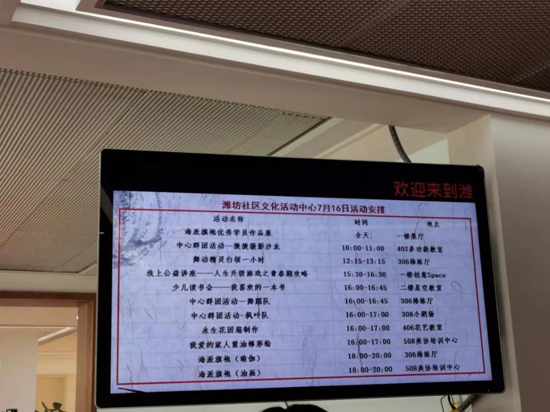 圖為濰坊社區(qū)文化活動中心一樓的電子顯示屏,羅列了當(dāng)天的各項活動安排。求是記者 侯亞景 攝