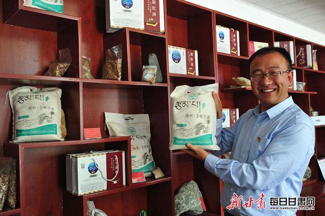 郵儲銀行甘肅省分行扶貧工作辦公室高級副經(jīng)理、碌曲縣阿拉鄉(xiāng)吉扎村駐村幫扶工作隊隊長兼第一書記齊斌展示扶貧車間生產(chǎn)的青稞炒面