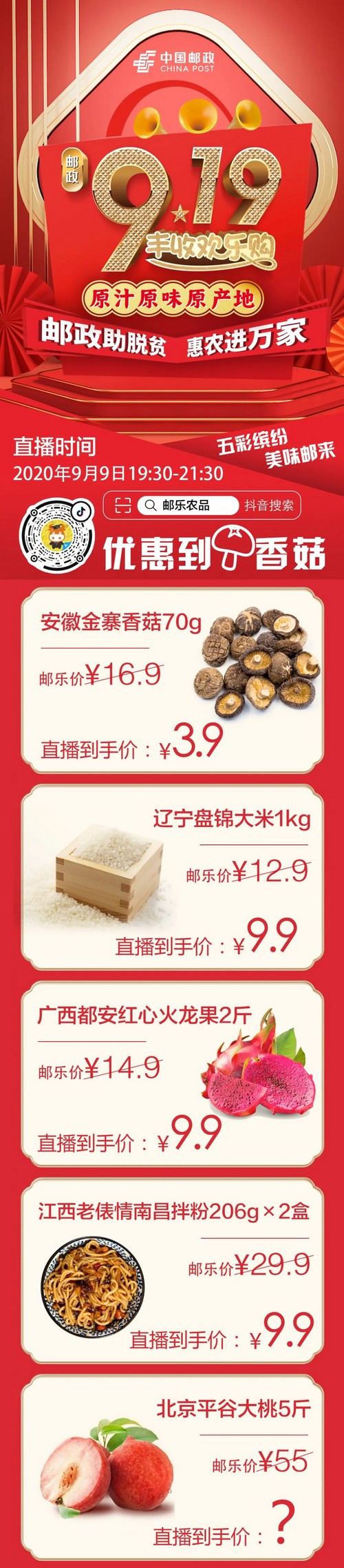 專題首頁> > 中國郵政集團有限公司 > 個性化專題 > 郵政919 豐收歡樂購 > 走進919 > 中國郵政919電商節首場預熱直播來啦!