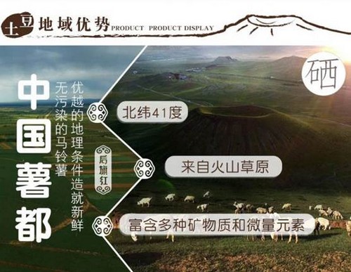 “后旗紅”土豆是馬鈴薯的一個(gè)品種,因種植在中國(guó)薯都烏蘭察布察右后旗而得名?!昂笃旒t”馬鈴薯種植基地位于察哈爾火山地質(zhì)公園火山群下,北緯41度。采用微噴方式,水源來(lái)自150米火山巖下深層礦泉水。其產(chǎn)地烏蘭察布察哈爾右翼后旗,地屬溫帶大陸性季風(fēng)氣候,無(wú)霜期短、晝夜溫差大,降雨集中在馬鈴薯生長(zhǎng)期季節(jié),雨熱同季,土壤為沙性土,為馬鈴薯生長(zhǎng)提供了得天獨(dú)厚的優(yōu)越條件。
