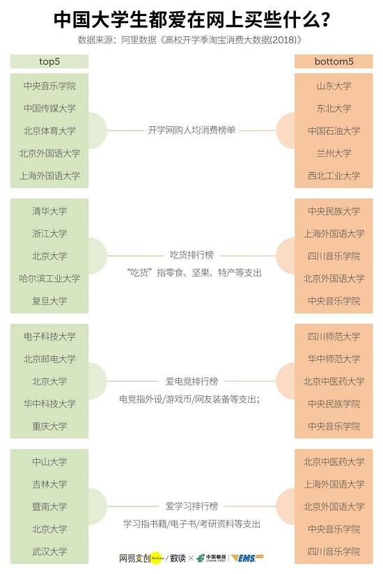根據(jù)往年的數(shù)據(jù),大學(xué)開學(xué)季,中國高校大學(xué)生網(wǎng)購消費(fèi),往往會達(dá)到一個(gè)小高峰。阿里數(shù)據(jù)則顯示,開學(xué)網(wǎng)購人均消費(fèi)高校榜單中,中央音樂學(xué)院、中國傳媒大學(xué)、北京體育大學(xué),以最高的人均消費(fèi)排名前三。