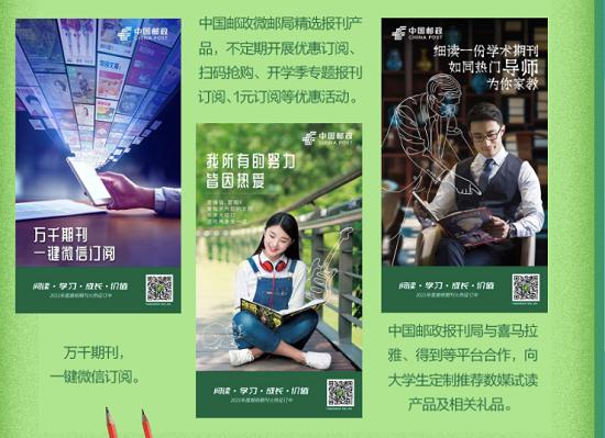 面對高校學(xué)生,還有各類文藝雜志、報(bào)刊優(yōu)惠訂閱服務(wù),萬千期刊,均能微信一鍵訂閱。中國郵政微郵局精選報(bào)刊產(chǎn)品,更是不定期開展優(yōu)惠訂閱、掃碼搶購、開學(xué)季專題報(bào)刊訂閱、1元訂閱等優(yōu)惠活動!甚至還聯(lián)合喜馬拉雅、得到等平臺,提供數(shù)媒試讀和相關(guān)禮品,可以說是誠意滿滿。
