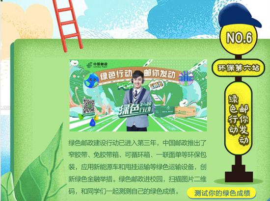 加油第六站,中國郵政倡導(dǎo)和大家一起實(shí)行綠色郵政,共創(chuàng)綠色家園。在推廣綠色郵政的三年中,中國郵政圍繞21項(xiàng)環(huán)保指標(biāo),不斷升級,比如提供窄膠帶、免膠箱,使用環(huán)保材料,進(jìn)行環(huán)保投遞,綠郵行動,郵你發(fā)動,快來一起測測你的綠色成績!
