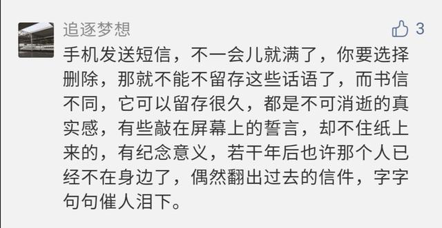 網友追逐夢想說:“手機發送短信,不一會兒就滿了,你要選擇刪除,那就不能留存這些話語了。而書信不同,它可以留存很久,都是不可消逝的真實感。有些敲在屏幕上的誓言,卻不如紙上來的,有紀念意義。若干年后也許那個人已經不在身邊了,偶然翻出過去的信件,字字句句催人淚下。”