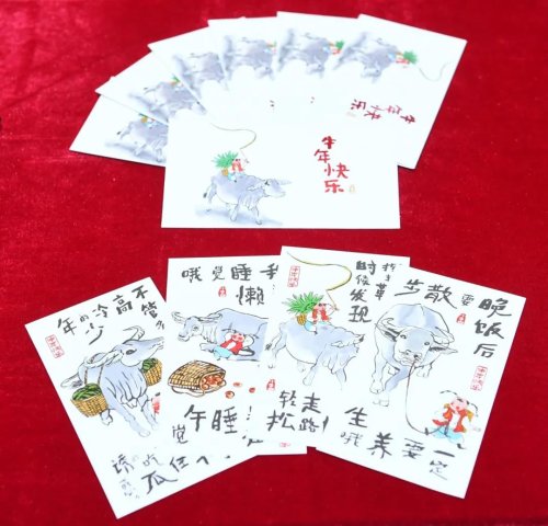 《牛年快樂》普通明信片的郵資圖選取了第二輪生肖牛郵票剪紙原作者齊秀花的作品,由王虎鳴設計,畫面中的牛昂首向上、充滿力量。兩套明信片分別采用水彩繪畫及水墨手繪形式,畫面溫暖充滿童趣,展現出濃厚的春節民俗特色,分別由景紹宗及段雅婕、潘振磊設計?!缎脸蠹椤窐O限明信片由韓美林先生設計指導,明信片正面左下角圖案及背面圖案與郵資圖相同,形成極限概念,四枚明信片廣告面可組成完整的“恭賀新春”吉祥短語。祝福卡《牛年如意》《新春送?!?,畫面以健碩而充滿活力的牛為主要形象,傳遞國裕民康的良好祝愿,分別由張旺、武世寧設計。2021年賀年專用郵票分別為《國裕家康》《新春送?!罚瑑商奏]票構成的小全張,以紅色、金色為主體色調,將“?!弊?、甲骨文的“門”字及中國書畫中的斗方元素進行組合設計,寓意歲月更新福滿門、開門見福迎新春?!秶<铱怠酚身n美林設計,《新春送福》由陳楠設計。相關產品自11月5日起在全國郵政網點銷售,廣大用戶可在郵政網點和中國郵政微商城明信片專區選購。