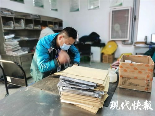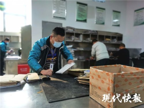 12月8日上午9點(diǎn),現(xiàn)代快報(bào)記者走進(jìn)宿遷市郵政城區(qū)分公司時(shí),李元明正忙著給一批已經(jīng)分類好的郵件和包裹蓋上郵戳。“啪啪啪啪……”隨著一聲聲脆響,摞得小山一樣高的包裹很快就被處理好,速度快得像是開了三倍速一般。
