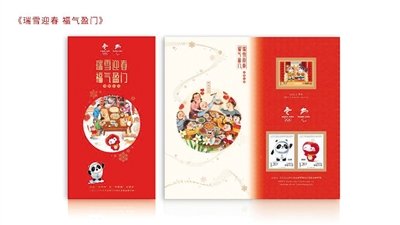 《瑞雪迎春 福氣盈門》拜年封卡折套裝是為慶祝北京2022年冬奧會倒計時一周年,同時迎接2021年春節而打造的一款年貨,由一枚貼有辛丑年生肖郵票的拜年紀念封和插有拜年郵票與吉祥物郵票的郵折組成。郵折封面大紅色基調,由雪花、大門、全家福組成;郵折內含有《北京2022年冬奧會吉祥物和冬殘奧會吉祥物》郵票一套2枚,《拜年》郵票一套1枚。紀念封卡折套裝可作為新年賀卡,通過郵寄的傳統方式向遠方的親友送去問候;還可插放壓歲錢,作為新年紅包傳遞祝福。