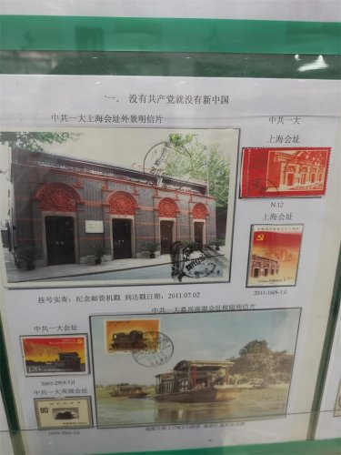 展覽不僅展出了郵票,還包括極限明信片、實寄封、紀念封等,品類多樣。比如這張中共一大嘉興南湖會址極限明信片,其上方的郵票、明信片和郵戳上的圖案高度一致,均表現的是嘉興南湖紅船。