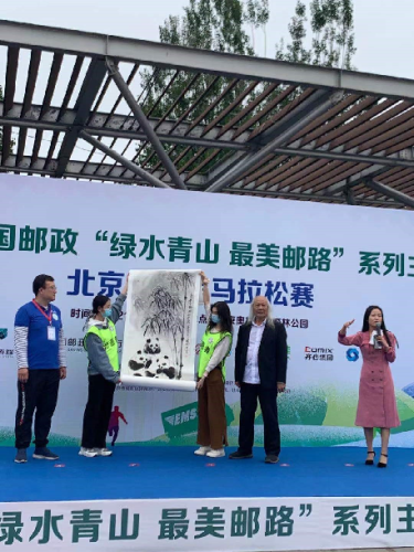 16日,2021年中國郵政“綠水青山最美郵路”系列主題賽北京站——“逐夢冬奧 相約北京”半程馬拉松賽,暨“祝福冬奧”明信片首發式在北京奧林匹克森林公園舉辦?;顒蝇F場,“祝福冬奧”明信片原畫作者楊竹向體育郵局捐贈畫作。