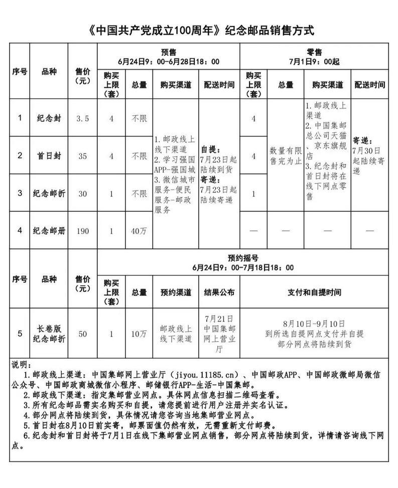 搖號品種及數(shù)量:長卷版紀(jì)念郵折內(nèi)含《中國共產(chǎn)黨成立100周年》長卷郵票折1本,售價50元。線上線下共10萬個中簽指標(biāo)。每人具有1次搖號資格。