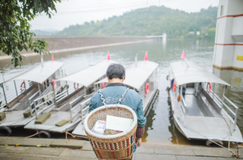 重慶大足區(qū)化龍湖上冷風(fēng)颼颼,空無(wú)一人。郵遞員黃曉利,背著滿滿一背簍的包裹來(lái)到碼頭,成為今天的第一位船客。