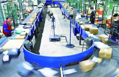 在中國郵政衡陽郵區(qū)中心局郵件處理中心,工作人員在分揀快遞包裹。 新華社發(fā)