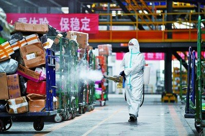 在中國郵政寧夏銀川郵區(qū)中心局郵件處理中心,工作人員在分揀車間進(jìn)行消殺作業(yè)。 新華社發(fā)