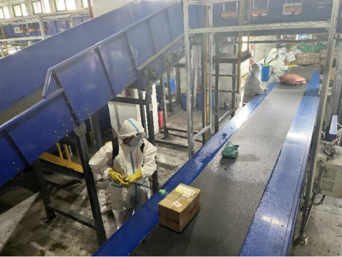 郵件到達營投部后,郵政人員對車輛和郵件還要進行全面消殺。“工作人員上崗前發(fā)送健康碼和行程碼,到崗后第一件事先測量體溫做好登記,佩戴手套、口罩等,然后對車輛全部消殺一遍,對郵件外包裝至少每2小時進行一次消殺……”中國郵政集團有限公司南京市鼓樓區(qū)寄遞事業(yè)部副總經理馬曉東說道,營投部每日進行多頻次消殺和通風,從操作間地面、快遞傳送帶到每一個快遞包裹,都會噴灑消毒,確保全覆蓋、無死角,保證生產生活環(huán)境清潔安全。