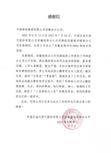 今年8月份,亳州市分公司還收到了來自中國石油天然氣股份有限公司安徽亳州銷售分公司的感謝信,感謝亳州市分公司在安徽銷售分公司巡察期間提供的高質量郵政服務。