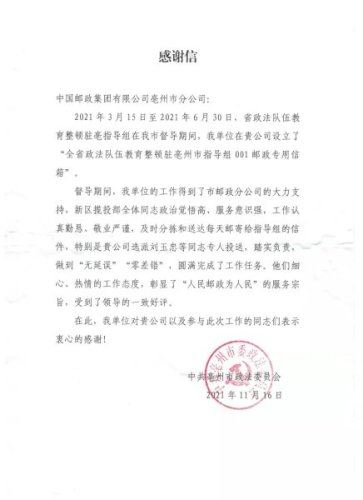 2021年3月15日至6月30日,省政法隊伍教育整頓駐亳指導組在亳州督導期間,在亳州郵政申請開通了專用信箱用于接收相關郵件。亳州市分公司新區(qū)攬投部政治覺悟高,服務意識強,工作認真勤懇,嚴謹敬業(yè),每天及時分揀和投遞信件,做到“無延誤”“零差錯”,圓滿完成了工作任務。