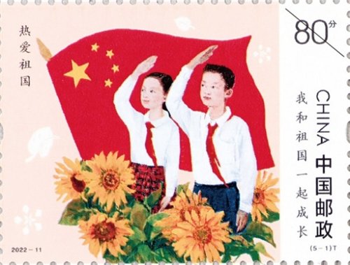 6月1日,《我和祖國(guó)一起成長(zhǎng)》特種郵票發(fā)行。該郵票一套5枚,郵票圖案名稱分別為《熱愛祖國(guó)》《刻苦學(xué)習(xí)》《崇尚科學(xué)》《強(qiáng)健體魄》《尊重勞動(dòng)》。