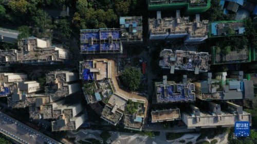 這是重慶市北碚區(qū)新房子片區(qū)老舊小區(qū)改造項(xiàng)目施工現(xiàn)場(2021年10月23日攝,無人機(jī)照片)。新華社發(fā)(秦廷富攝)