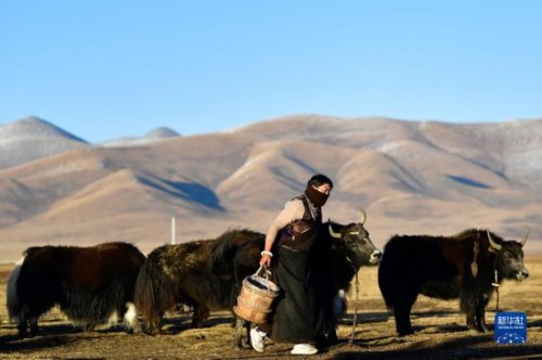 青海省玉樹藏族自治州稱多縣珍秦鎮(zhèn)二村牧民扎西德藏準(zhǔn)備給牦牛擠奶(2020年10月28日攝)。新華社記者 張龍 攝
