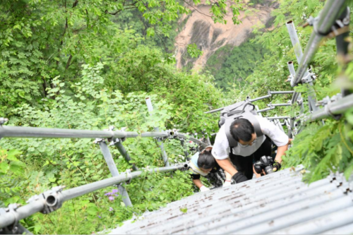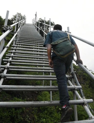 沿著石土混合的臺(tái)階而上,一會(huì)兒功夫,一段段鋼架搭成的鋼梯就映入眼簾,只見梯子每一級(jí)由2-3根獨(dú)立的鋼管焊接而成,鋼管圓圓的,感覺稍不留神很容易踏空和滑倒。