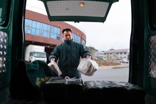 在貴州省龍里縣草原路郵政郵件處理中心外,莫富元將當天需要投遞的物品拿上小貨車(2月14日攝)。