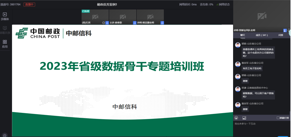 首次培訓(xùn)已于4月19日下午舉行,培訓(xùn)時長2.5小時,培訓(xùn)內(nèi)容為2022年數(shù)據(jù)創(chuàng)新勞動賽優(yōu)秀案例,共三個,分別是《寄遞業(yè)務(wù)客戶資費(fèi)風(fēng)險管理模型》《風(fēng)險防控方向智慧風(fēng)控體系下金融員工道德風(fēng)險識別》《郵政農(nóng)品數(shù)字化運(yùn)營與智能營銷》,來自郵儲總行、中郵消費(fèi)等多家單位,各省數(shù)據(jù)中心、信息技術(shù)中心和部分地市數(shù)據(jù)條線的骨干共計340余人參加了此次培訓(xùn)。