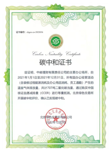 在以“眾生的地球”為主題的第54個世界地球日到來之際,北京綠色交易所為首批開業的銀行理財子公司“中郵理財”出具組織運營層面“碳中和”證書。由此,中郵理財成為國內領先的獲得權威機構認證的“碳中和理財公司”,為世界地球日增添一抹新的綠色。