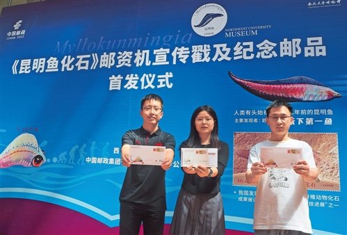 “5·18”國際博物館日當(dāng)天,《昆明魚化石》郵資機宣傳戳及系列紀念郵品首發(fā)儀式在西北大學(xué)博物館舉行。此次發(fā)行的《昆明魚化石》郵資機宣傳戳及明信片、信封一套,郵資機宣傳戳以昆明魚化石及昆明魚復(fù)原圖為主圖,明信片以寒武紀早期生態(tài)復(fù)原圖為畫面進行設(shè)計,信封用手繪圖的方式展示昆明魚與“西大動物”的形象區(qū)別,并展現(xiàn)生物從魚到人的進化過程。
